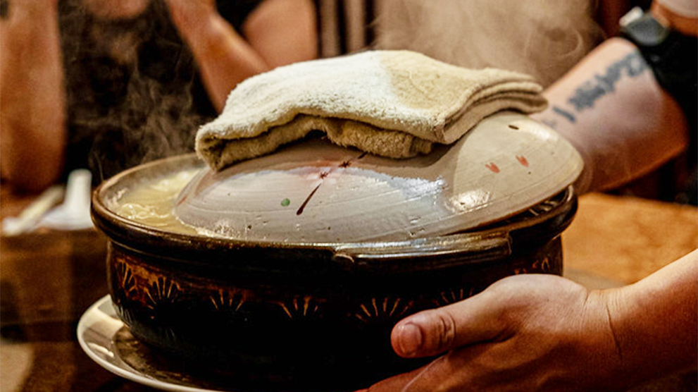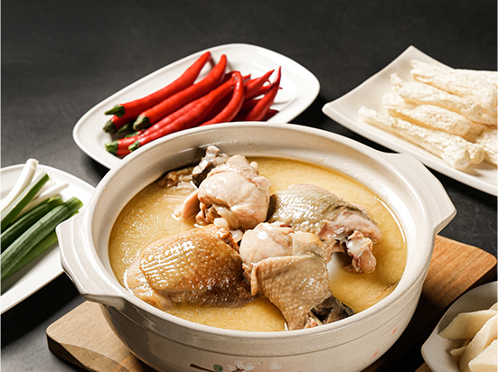 砂鍋土雞湯以放養土雞搭配金華火腿、干貝與老母雞等食材,慢火細燉至乳白濃郁,把時間煉成風味。