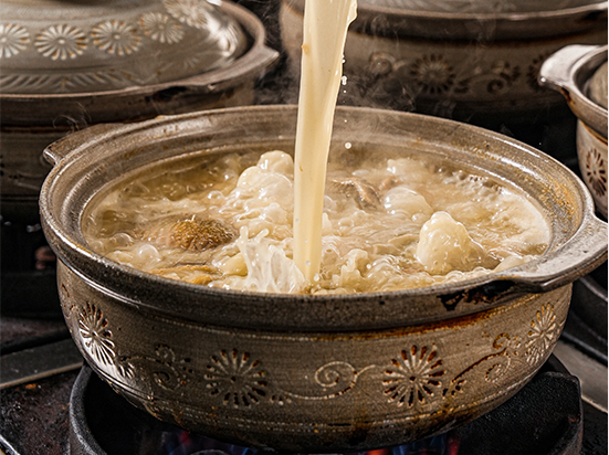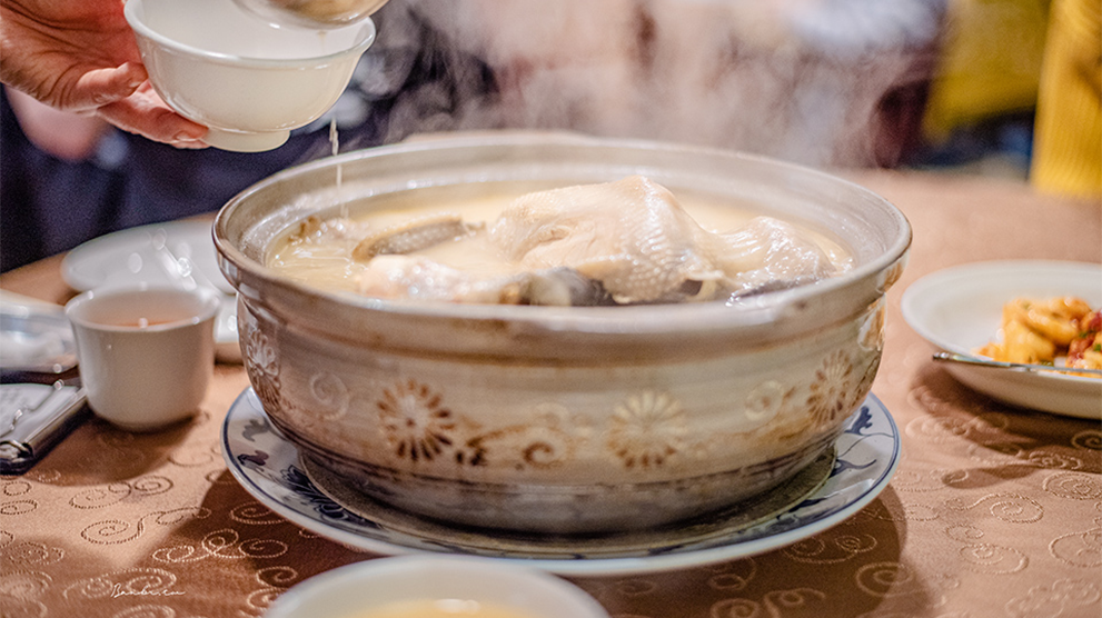 湯底選用台灣東部放養土雞,搭配金華火腿、干貝與老母雞等食材,大火熬煮,直到湯色乳白、金黃馥郁。